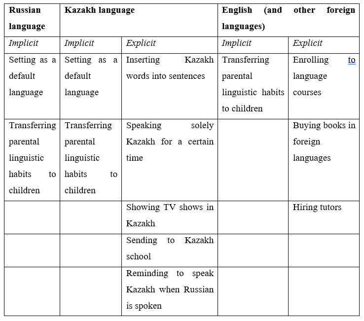 This study found that bilingual families in Kazakhstan employ implicit and explicit strategies at home. Parents can implicitly set a default language at home out of their proficiency level or comfort. It causes the other members of the household to switch to the default language, which consequently becomes the dominant language at home. Moreover, parents can implicitly transfer their linguistic habits to children, such as speaking accurately or learning foreign languages.