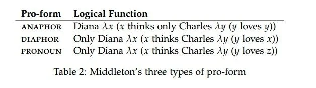To a first approximation, the anaphors in Middleton’s system correspond to locally bound reflexives — elements that must be bound in a local domain. The diaphors are what are sometimes