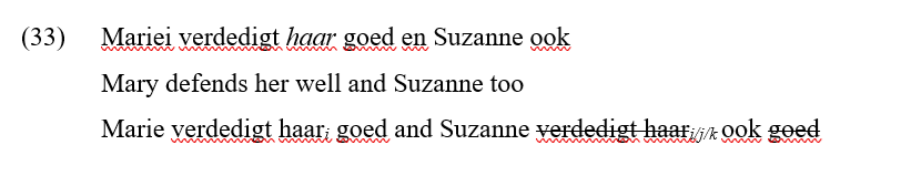 Again, a proper test of these predictions will require an extensive and systematic investigation, based on language-specific expertise and taking measures to control for potential interfering factors (like the effects of the parallelism constraint on ellipsis sites, which can be expected to rule out certain readings independent of whether one adopts a PUB or RUB approach). Nonetheless, to illustrate the test we have consulted with a Brabant Dutch informant, who speaks a dialect — Heusden Dutch — with an AAA pattern similar to that in Mechelen Dutch. They tell us that, for them, the example in (33), where the pro-form in the first conjunct is interpreted as locally bound, does not come with an obligatory sloppy reading in the ellipsis site, although the sloppy reading is the preferred one.