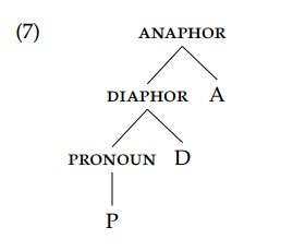 The structure of the anaphor contains that of the diaphor, which in turn contains that of the pronoun. There is a sense in which the structural complexity reflects the degree of restrictedness of the interpretation. At the most basic level of the P we find whatever interpetive information is common to all nominal pro-forms. The D head that builds diaphors adds a restriction that this element must be bound by an antecedent, and the A head adds an additional restriction that this antecedent be local. Coupled again with suitable assumptions about spell-out, this structure can be used to capture the constraints on possible syncretisms that Middleton observes.