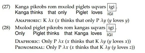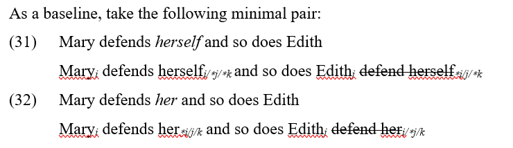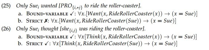 The different readings can be highlighted by clarifying what alternatives only is ruling out in each case. For (25), the implication is that Nobody else wanted to ride the roller-coaster (sloppy), not that Nobody else wanted Sue to ride the roller-coaster (strict). In contrast, for (26), the implication can be either that Nobody elsei thought shei was riding the roller-coaster (sloppy), or that Nobody elsei thought that Suej was riding the roller-coaster (strict). Similarly, a string containing an elided bound variable can only yield sloppy readings, while an analogous string containing a free one can yield strict or sloppy readings. An anaphor is conventionally understood to be an obligatorily-bound variable, with further internal sub-classifications having to do with whether this is also reflected in its syntactic structure or not (see e.g. Sundaresan, 2020, for discussion). A pronoun, in contrast, is an optionally bound one, as we have just seen. This means that an anaphor should yield only sloppy readings under ellipsis, while a pronoun should be able to yield strict or sloppy readings under ellipsis.[7]