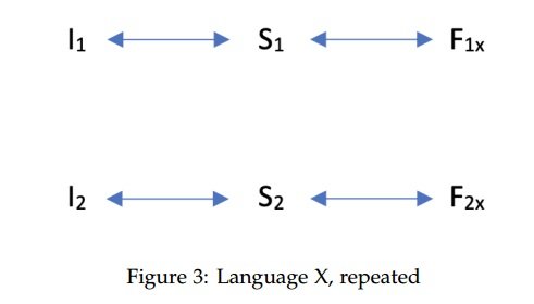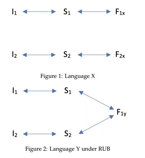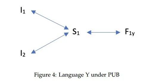 To illustrate the differences between RUB and PUB, let’s have another look at the analytic scenario presented in Section 2.1. Suppose again that Language X shows evidence that a particular interpretive contrast (I1 vs I2) is derived from a structural contrast (S1 vs S2), where the two structures S1 and S2 receive the exponents F1 and F2, respectively. This is depicted in Figure 3 below. In contrast, Language Y provides no morpho-syntactic evidence for such a structural