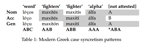 “Morphological paradigms can be ordered so as to observe the *ABA restriction, i.e. such that only contiguous cells in a paradigm are syncretic. Syncretisms thus reveal a hierarchy in paradigms, which is in turn accounted for in terms of a hierarchy of underlying features. Consequently, syncretisms can be used as a tool for the diagnosis of feature structures.” (Caha and vanden Wyngaerd, 2017)