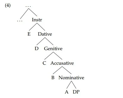 Caha (2009)’s proposal is that case involves articulated structures, where each case contains the next one down in the hierarchy, as in (4).